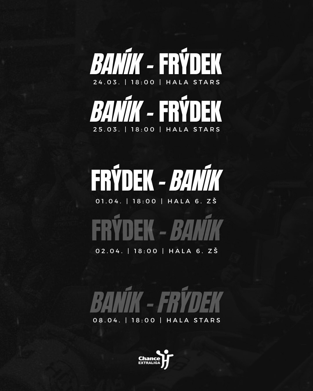 Baník vstupuje do čtvrtfinále play-off, ve kterém se utká s Frýdkem-Místkem. Série startuje dvěma domácími zápasy 24. a 25. března od 18:00 v hale STaRS, následně se přesune do Frýdku-Místku (1. 4., případně 2. 4.) a případný rozhodující pátý duel je na programu 8. dubna opět doma. Vstupenky zakoupíte zde.