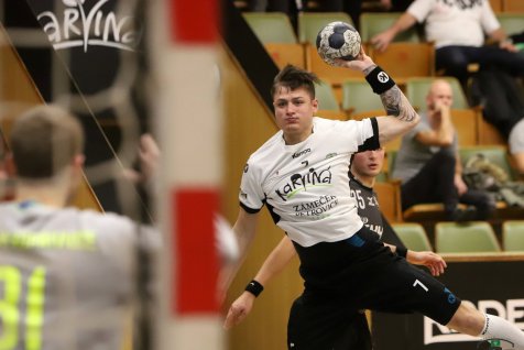V úvodních minutách vedli hosté, Jan Hanus skóre otevřel, následně vrátil svému celku vedení na 3:2. Karviná záhy otočila góly Urbańského a Dominika Soláka, o dvě minuty později vedla o branku znovu Kopřivnice. Přetahovaná pokračovala dál, Vojtěch Patzel třikrát v řadě vyrovnal, hosté se ale pokaždé vrátili zpět do těsného vedení, na 9:8 zvyšoval Jan Hanus. Ve čtrnácté minutě si vzal Michal Brůna první oddychový čas, ten ale nezvrátil vývoj a hosté se po chvíli dostali do tříbrankového vedení. Ani tentokrát netrvalo dlouho, Petr Široký dvěma góly snížil, vyrovnávací gól zařídil Solák a Matěj Nantl devět minut před poločasovou přestávkou otočil stav na 13:12. Úvodní dějství ukončil brankou Denis Harabiš, Karviná sice většinu poločasu dotahovala, do kabin i tak šla s dvoubrankovým náskokem.
