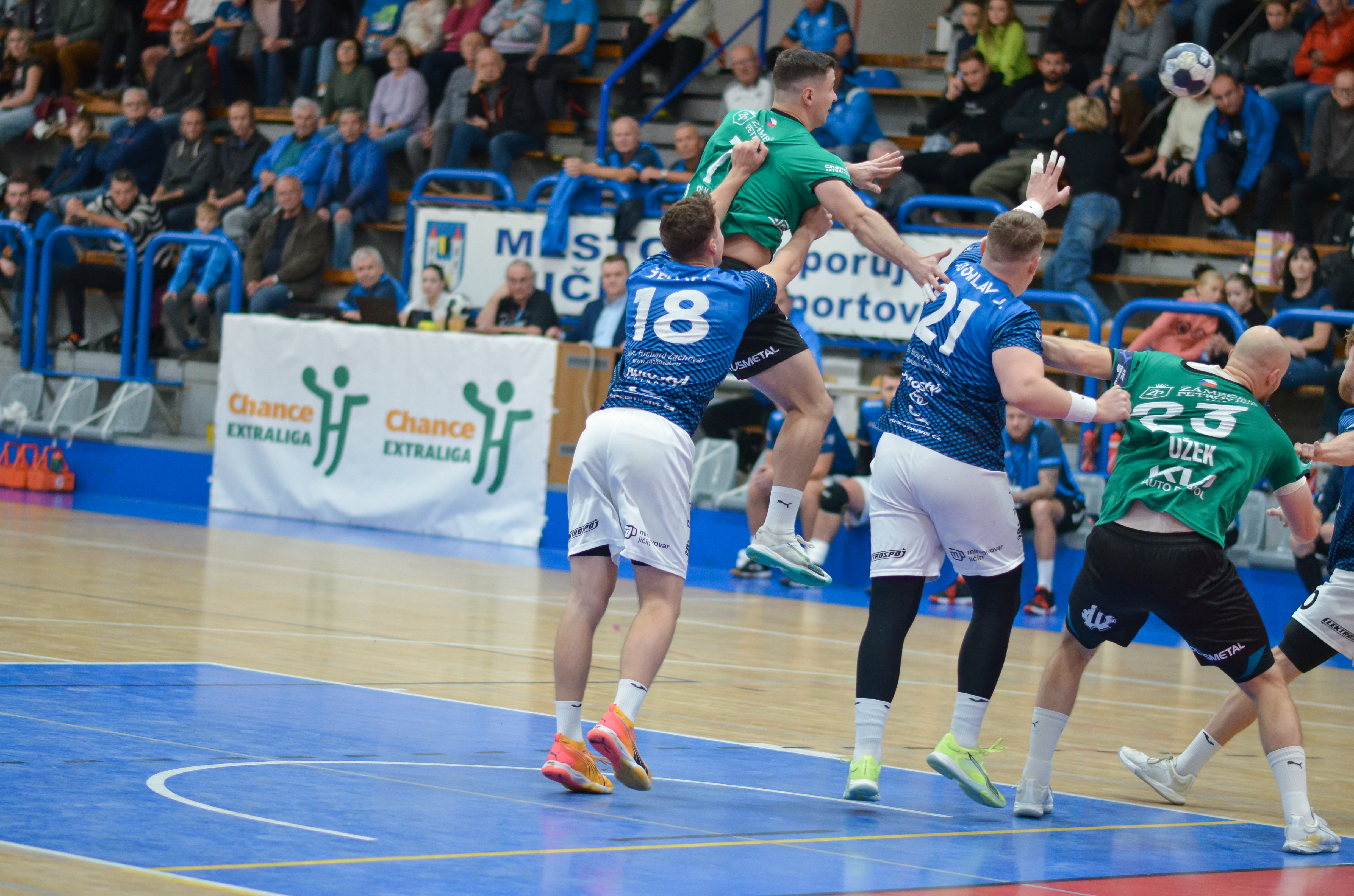Karviná vstoupila do zápasu ve velkém tempu a už ve 14. minutě vedla 8:1. Dobře organizovaná obrana, rychlý přechod do útoku a efektivní zakončení přinesly hostům klidný náskok, který si udrželi až do závěrečného hvizdu.