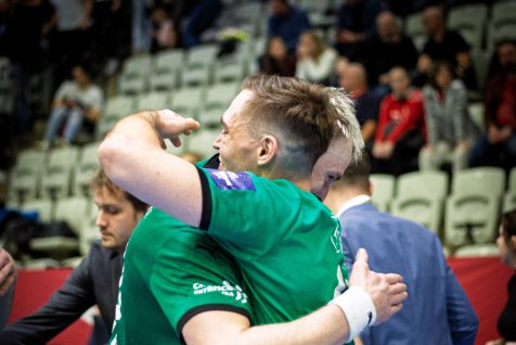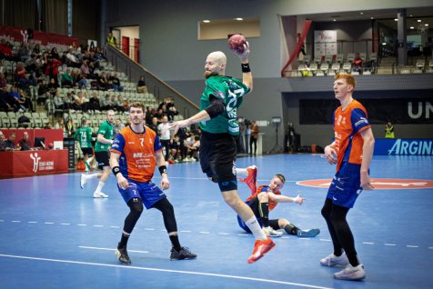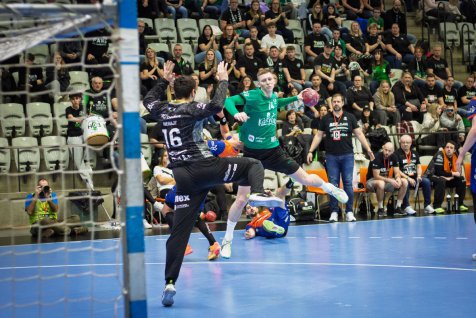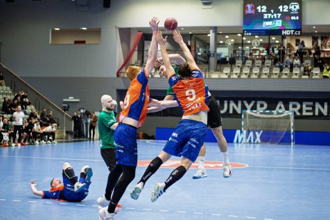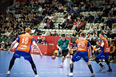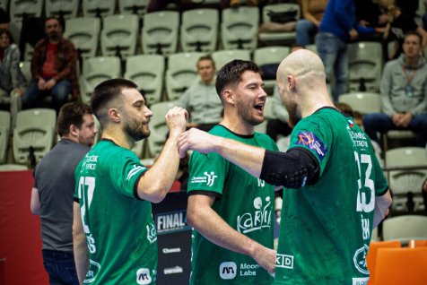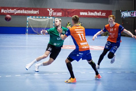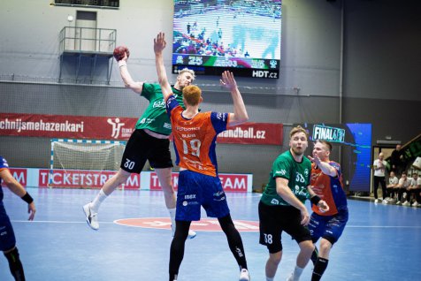 Karviná do semifinálového utkání proti Brnu vstoupila ve velkém stylu. Už po třech minutách vedla 3:0 a po celé první dějství si udržovala náskok. Brno se sice několikrát přiblížilo, ale Karviná vždy našla odpověď. Největší zásluhu na poločasovém vedení 18:12 měli Vojtěch Patzel a Matěj Nantl, kteří společně nastříleli 12 branek.