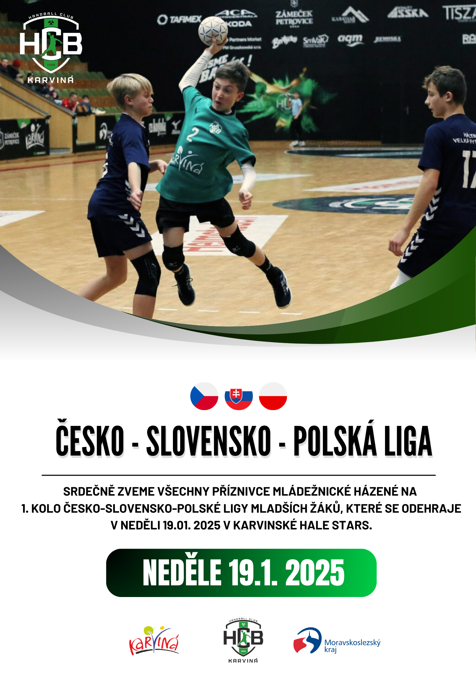Srdečně zveme všechny příznivce mládežnické házené na 1. kolo Česko-slovensko-polské ligy mladších žáků, které se odehraje v neděli 19.01. 2025 v Karviné hale STaRS.