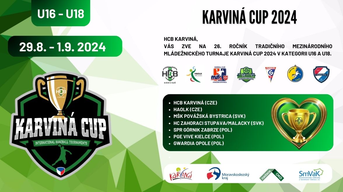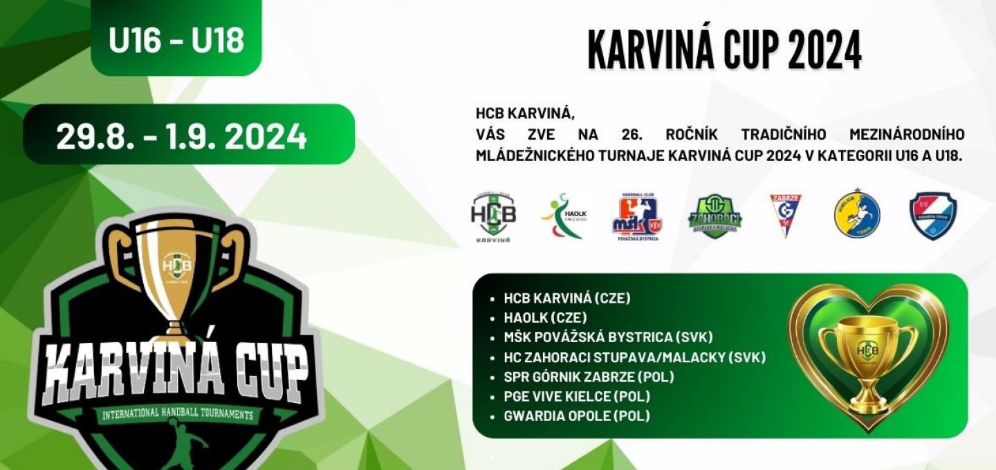 Srdečně vás zveme na již 26. ročník Karviná Cupu, prestižního mezinárodního turnaje dorostenecké házené, který se letos uskuteční od čtvrtka 29. srpna 2024 do neděle 1. září 2024.