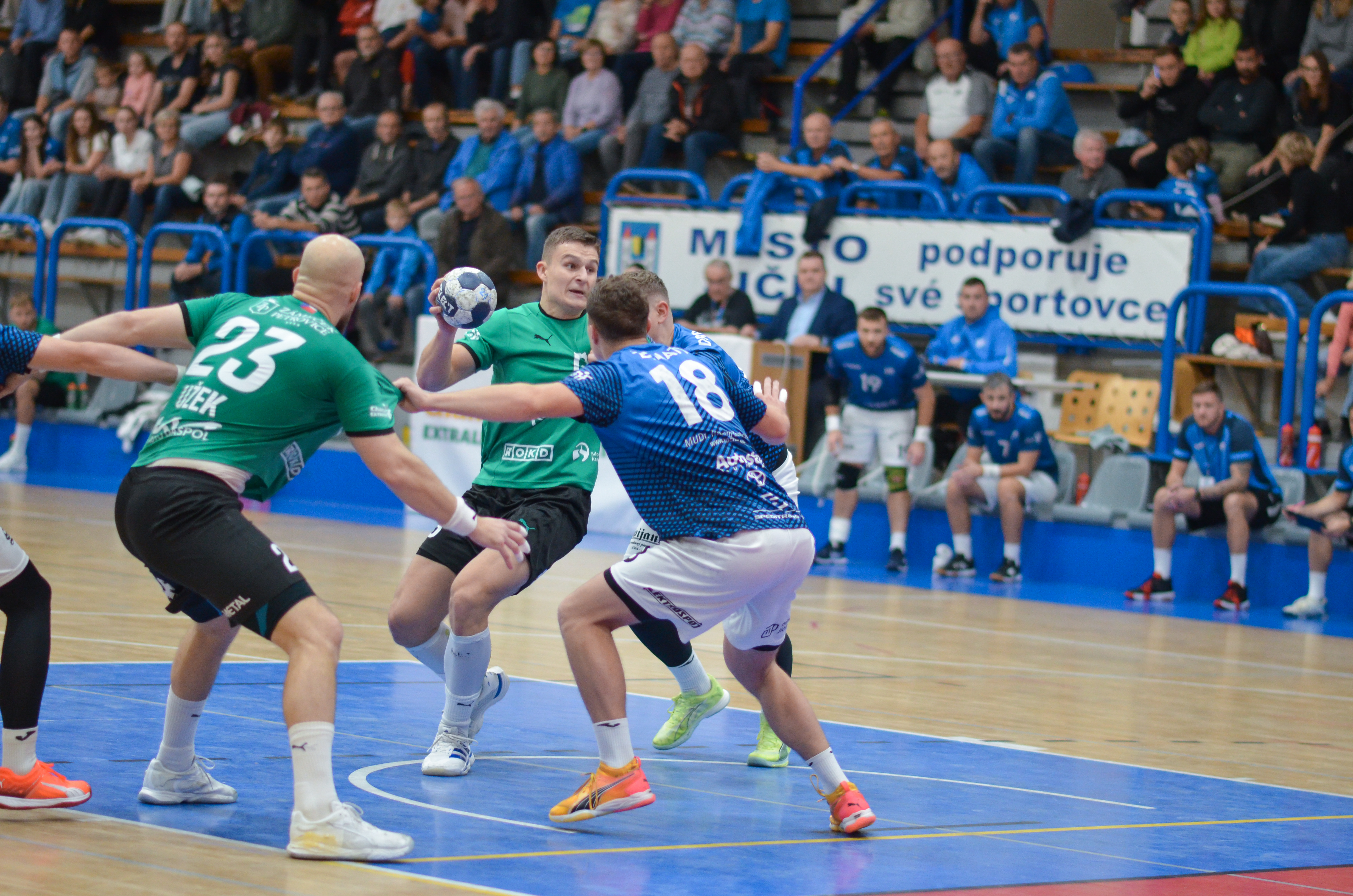 Karviná vstoupila do zápasu ve velkém tempu a už ve 14. minutě vedla 8:1. Dobře organizovaná obrana, rychlý přechod do útoku a efektivní zakončení přinesly hostům klidný náskok, který si udrželi až do závěrečného hvizdu.