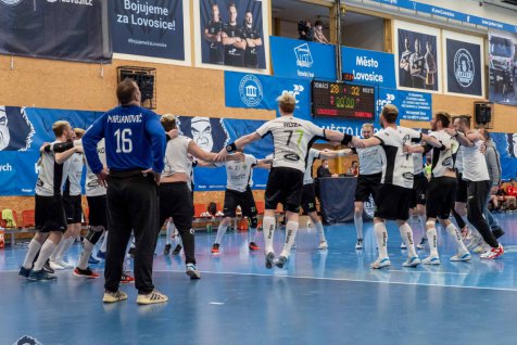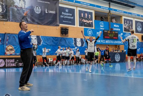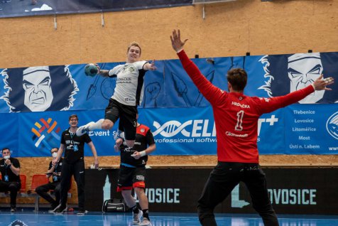 Začátek střetnutí o prodloužení série se Lovosicím vydařil podstatně lépe než nám. Téměř sedm minut jsme nedokázali skórovat a už za stavu 3:0 si trenér Brůna vybíral první oddechový čas v zápase. Ale i po něm se dařilo více domácím hráčům, kteří v 15. minutě vyhrávali 8:4. Během následujících dvou minut jsme dokázali třikrát skórovat a přiblížit se už na 8:7. Domácí házenkáři i nadále drželi vedení na své straně, ale závěr poločasu vyšel lépe našim hráčům. Dvě branky Ondřeje Skalického v předposlední minutě první půle nakonec stanovily vyrovnané skóre po třiceti minutách a ve druhé půli se tak začínalo jakoby od začátku.